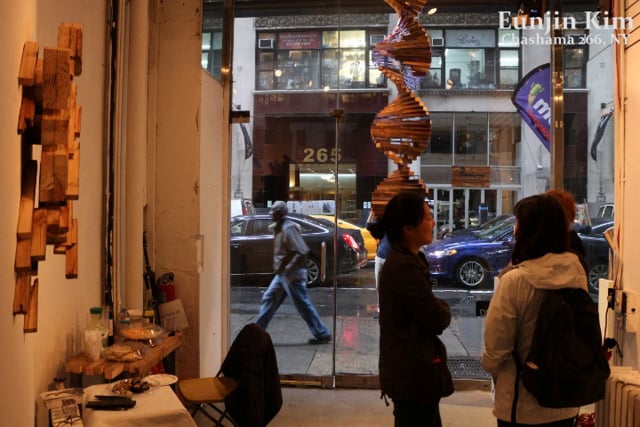 "All of the wood pieces in this exhibition are filled with agony. They were originally scaffolding used in construction sites to build the present of New York City. However, they were thrown away after they became useless as supporting materials after becoming broken, rotten or washed out."